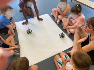 A piccoli passi si sono avvicinati al CODYFEET (rappresentare direttamente sul percorso le istruzioni da eseguire per percorrerlo attraverso delle tessere con il disegno dei piedi e la loro direzione) per poi arrivare a provare a programmare il robottino DOC e BUBBLE, un robottino che può disegnare.